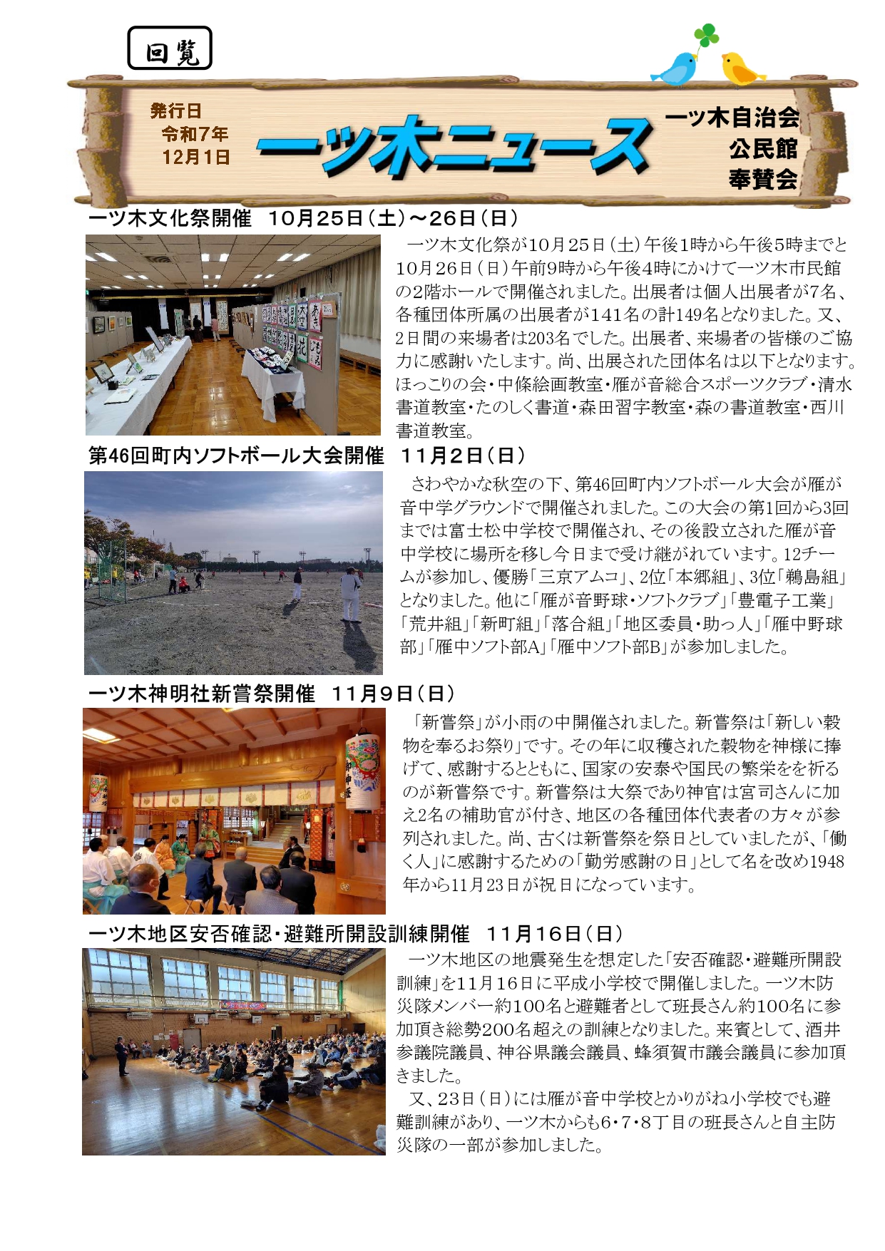 活動報告 【報告】一ツ木ニュース「一ツ木文化祭」「第46回町内ソフトボール大会」「一ツ木神明社新嘗祭」「一ツ木地区安否確認・避難所開設訓練」 2025年11月26日 by hitotsugi_it ▶ 一ツ木ニュース(PDF) 一ツ木ニュース「一ツ木神明社例大祭」「一ツ木祭りもち投げ」「一ツ木スポーツ祭り」「一ツ木子ども祭り」 防災, 一ツ木ニュース, 自治会・公民館, 自治会, 一ツ木文化祭, 町内ソフトボール大会