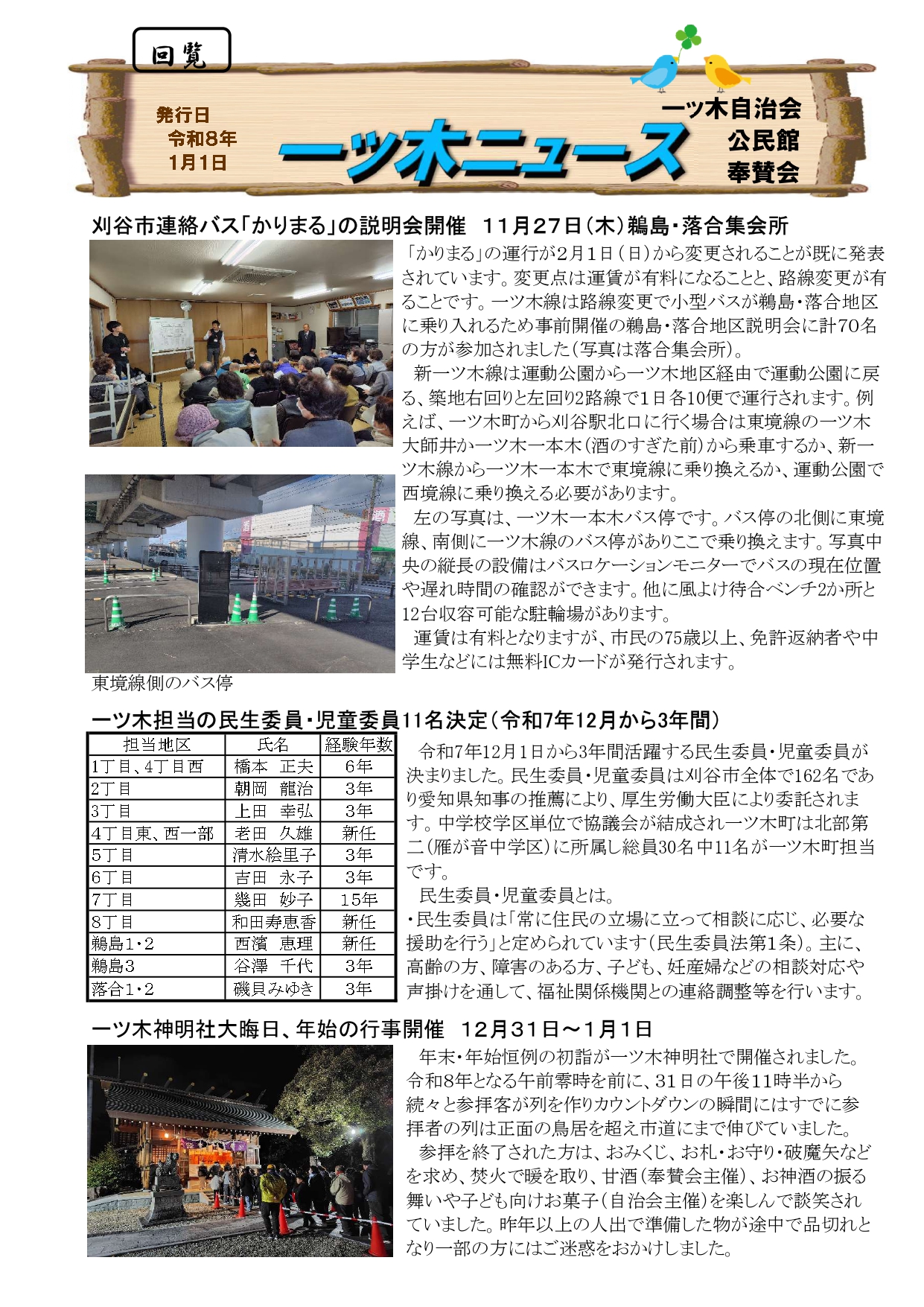 活動報告 【報告】一ツ木ニュース「刈谷市連絡バス「かりまる」の説明会」「民生委員・児童委員決定」「一ツ木神明社大晦日、年始の行事開催」 2026年1月5日 by hitotsugi_it ▶ 一ツ木ニュース(PDF) 一ツ木ニュース「刈谷市連絡バス「かりまる」の説明会」「民生委員・児童委員決定」「一ツ木神明社大晦日、年始の行事開催」 一ツ木神明社, 一ツ木ニュース, 自治会, かりまる
