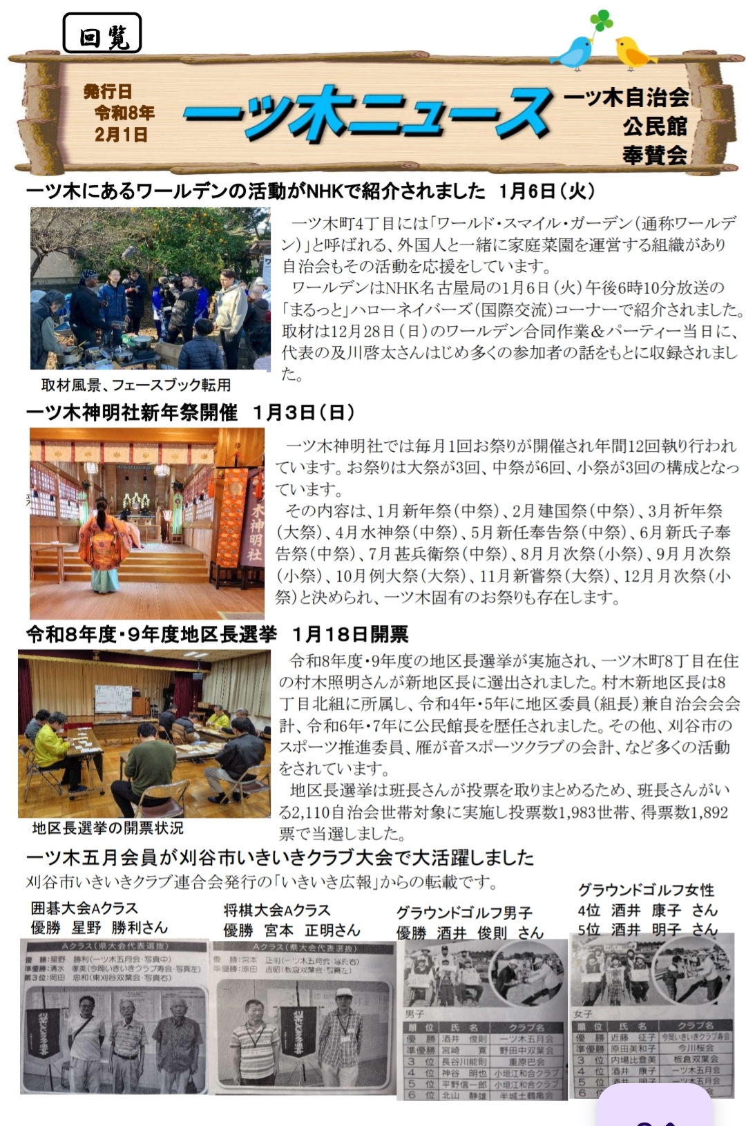 活動報告 【報告】一ツ木ニュース「ワールデンの活動がNHKで紹介」「一ツ木神明社新年祭開催」「地区長選挙」「一ツ木五月会員刈谷市いきいきクラブ大会」 2026年1月26日 by hitotsugi_it 一ツ木ニュース「ワールデンの活動がNHKで紹介」「一ツ木神明社新年祭開催」「地区長選挙」「一ツ木五月会員が刈谷市いきいきクラブ大会」 一ツ木ニュース, 自治会・公民館, 自治会, 地区長選挙, 一ツ木神明社新年祭, ワールデン, 五月会